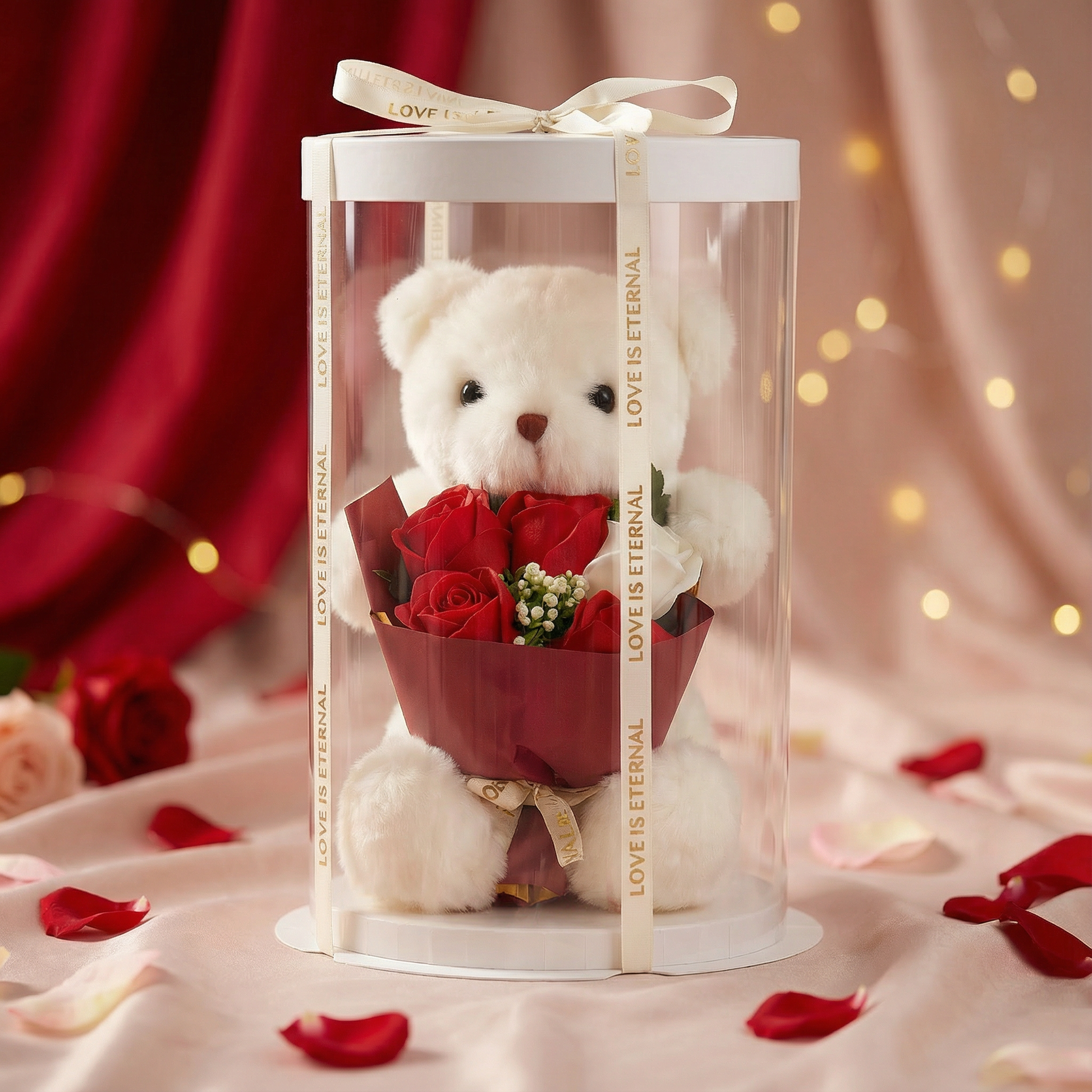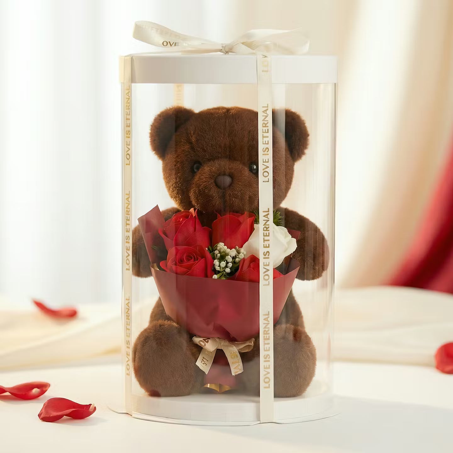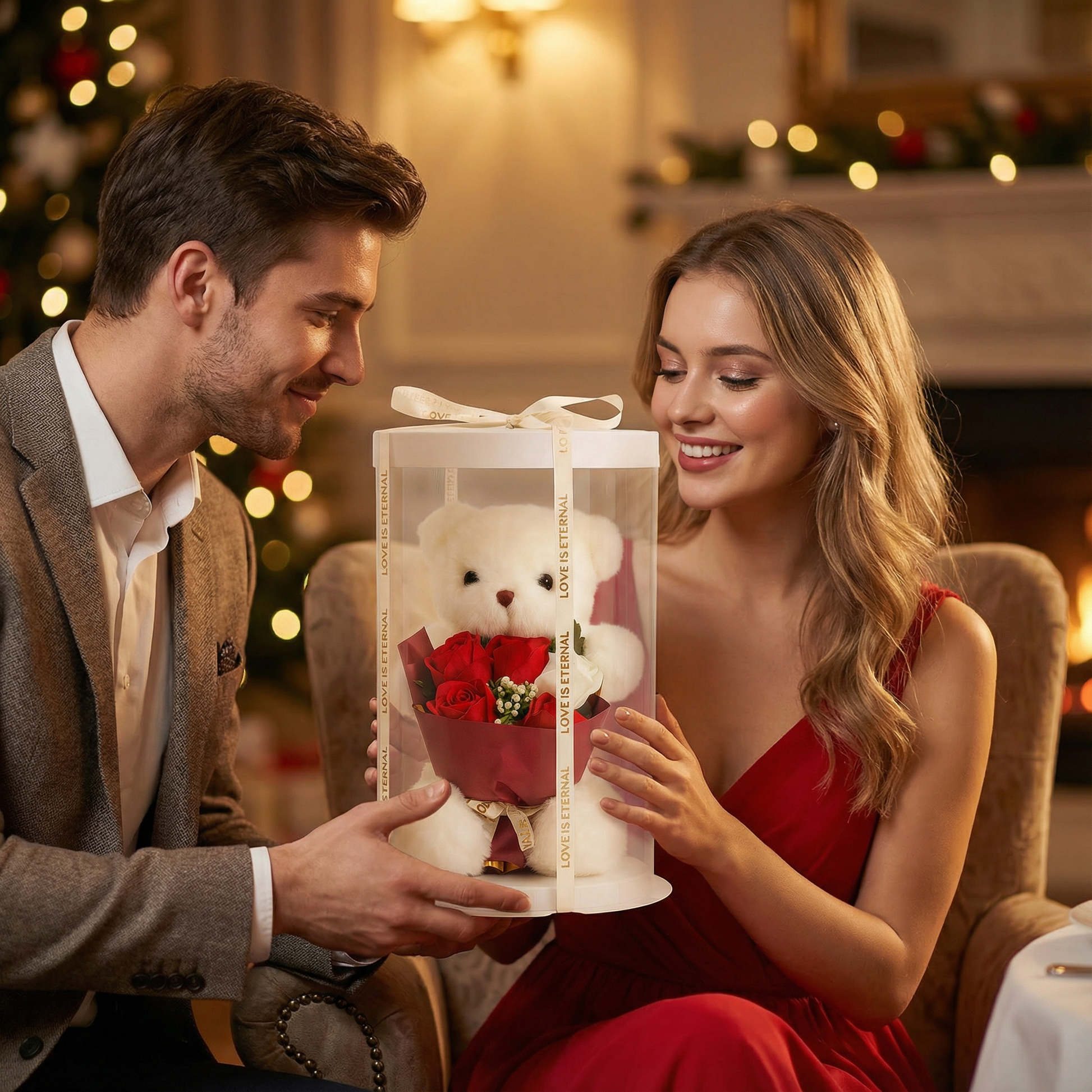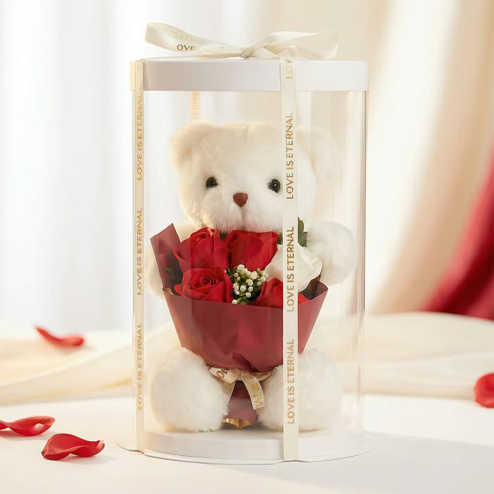 Miś z bukietem mydlanych róż zapakowany w eleganckie pudełko