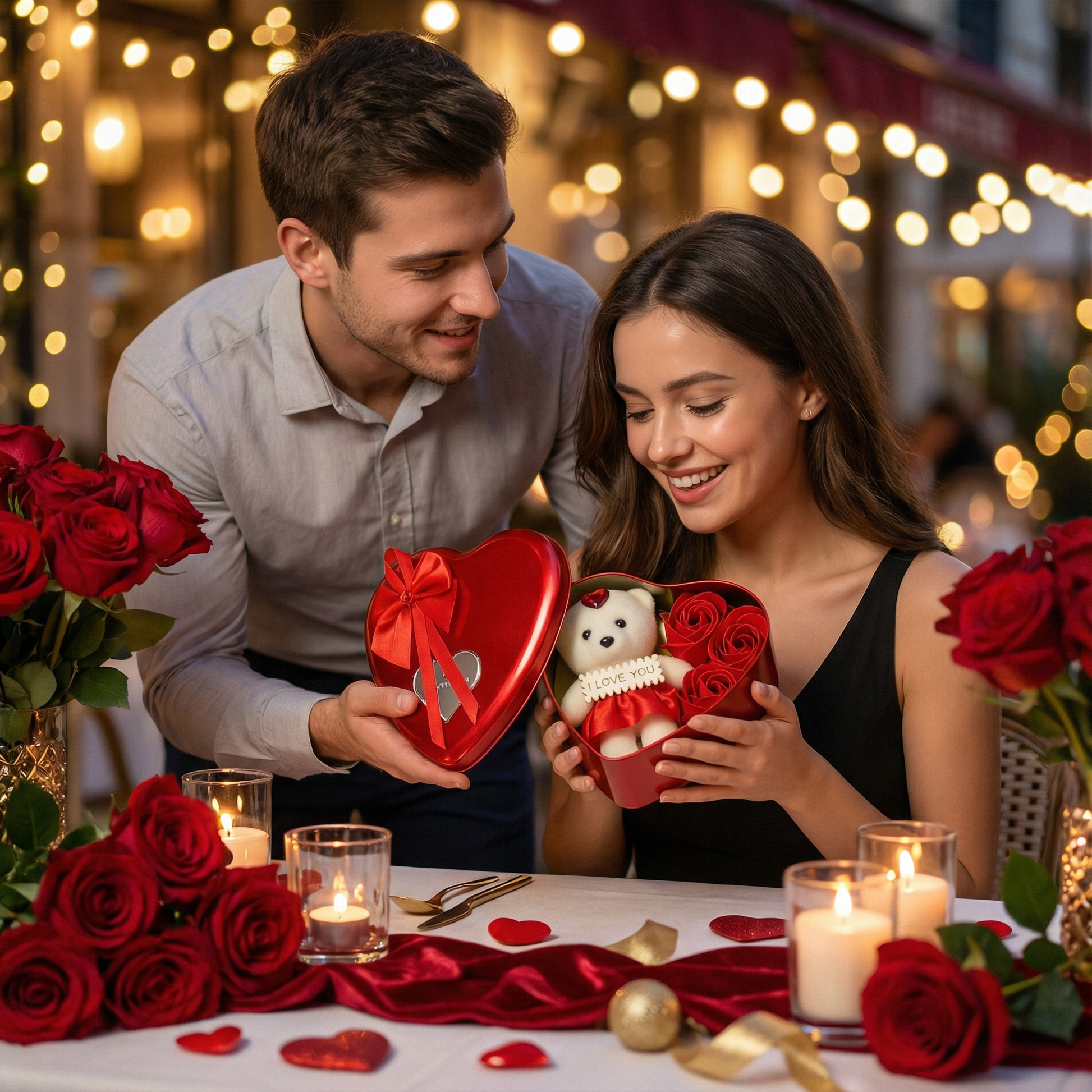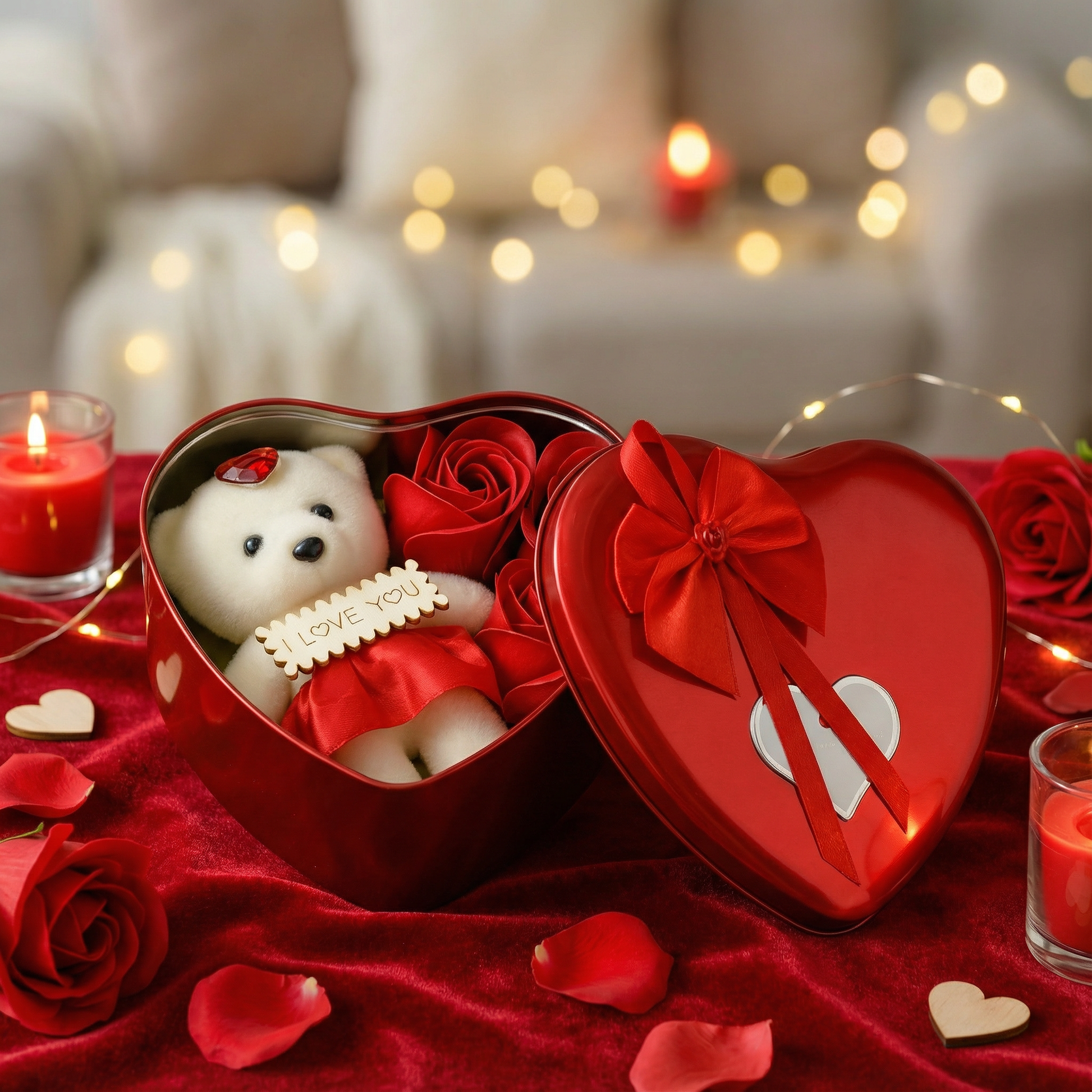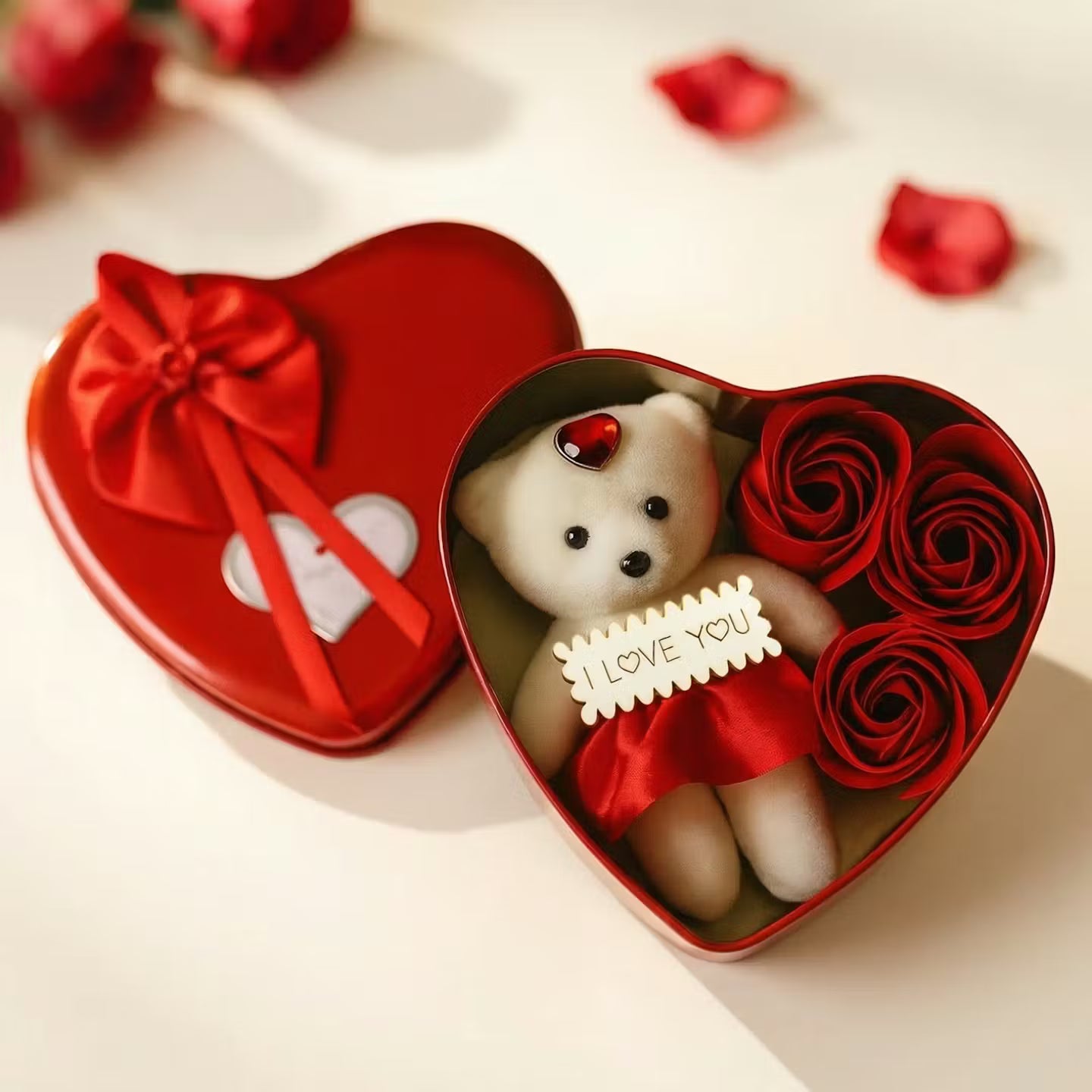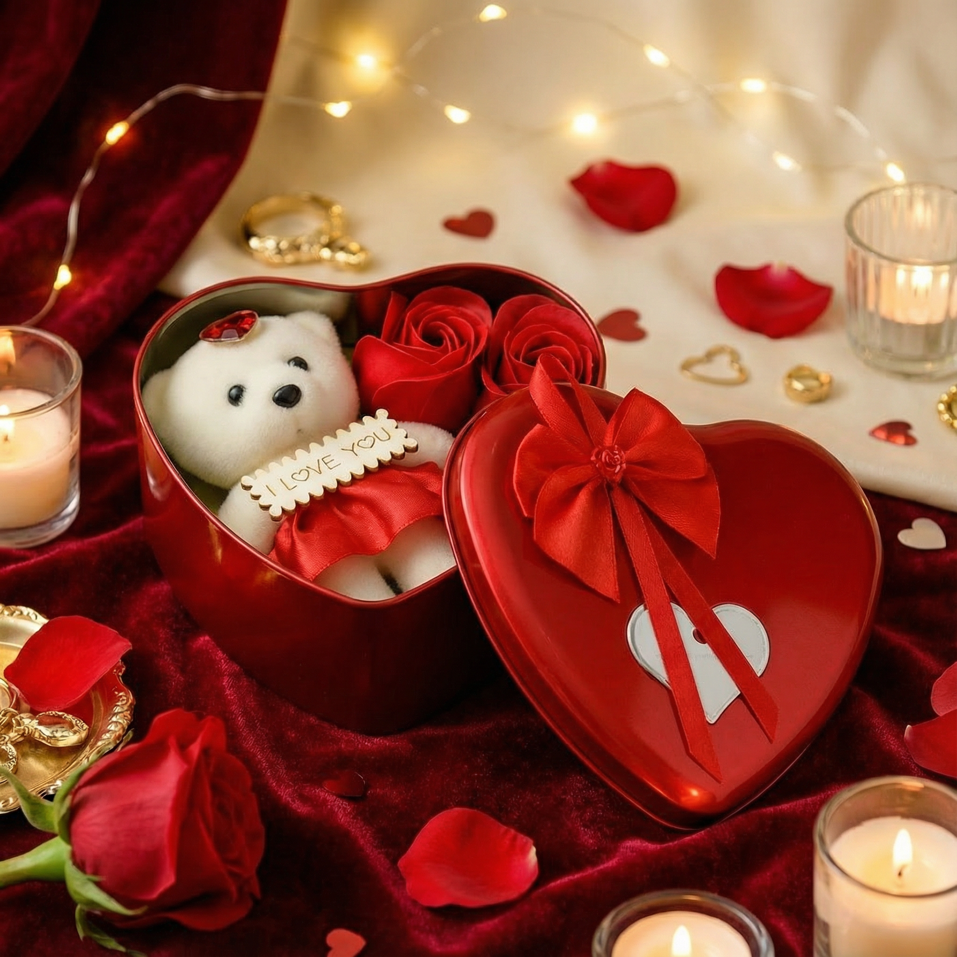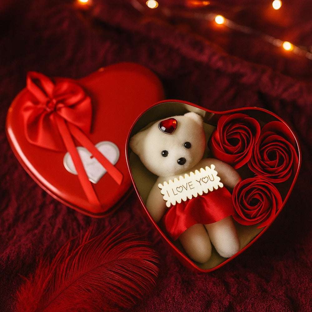 Podaruj wyjątkowe emocje zamknięte w eleganckim pudełku w kształcie serca. Uroczy miś trzymający tabliczkę „I Love You” w połączeniu z realistycznymi mydlanymi różami tworzy idealny prezent na każdą romantyczną okazję.