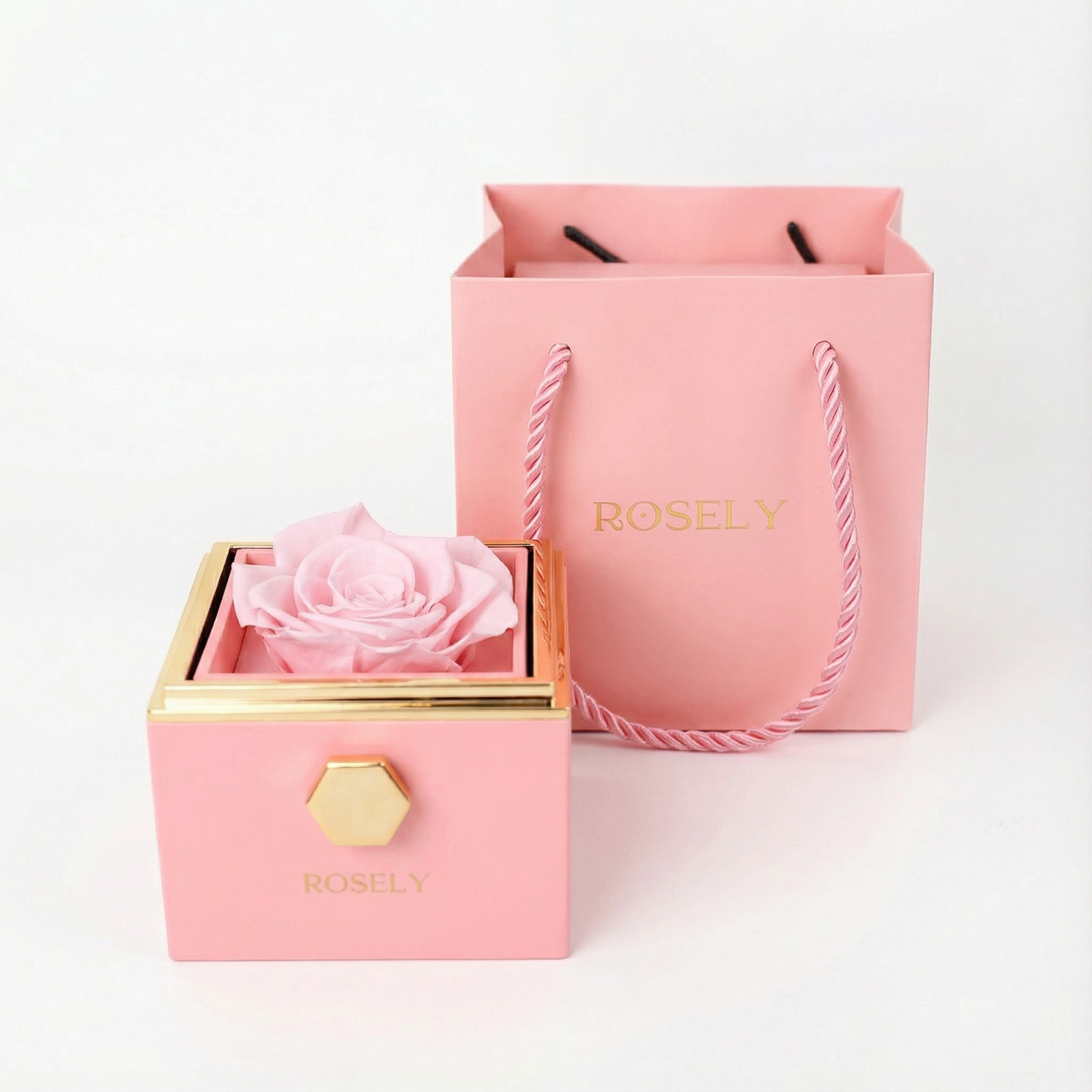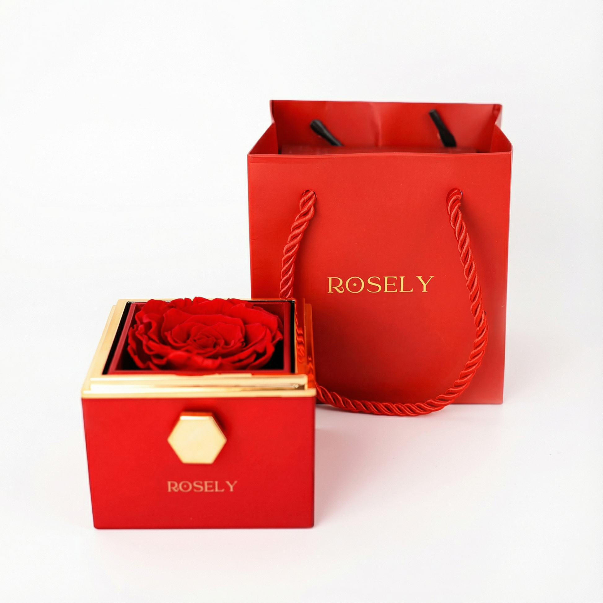 Róża zapakowana jest w eleganckie pudełko, które podkreśla jej luksusowy charakter. Dodatkowo w zestawie znajduje się dopasowana stylistycznie torebka prezentowa, dzięki czemu całość jest spójna, estetyczna i gotowa do wręczenia.