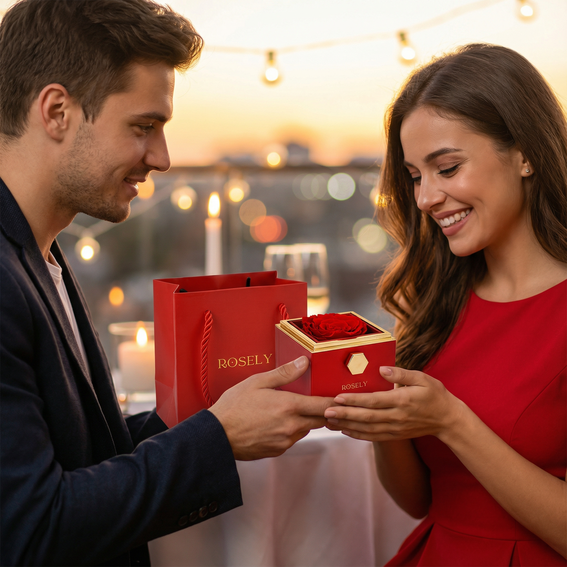 Wieczna róża Rosely 🌹 z eleganckim naszyjnikiem w kształcie połączonych serc ❤️ to wyjątkowy prezent, który wyraża uczucia, troskę i bliskość. Prawdziwa róża została poddana specjalnej konserwacji, dzięki czemu przez długi czas zachowuje świeżość i intensywny kolor ✨